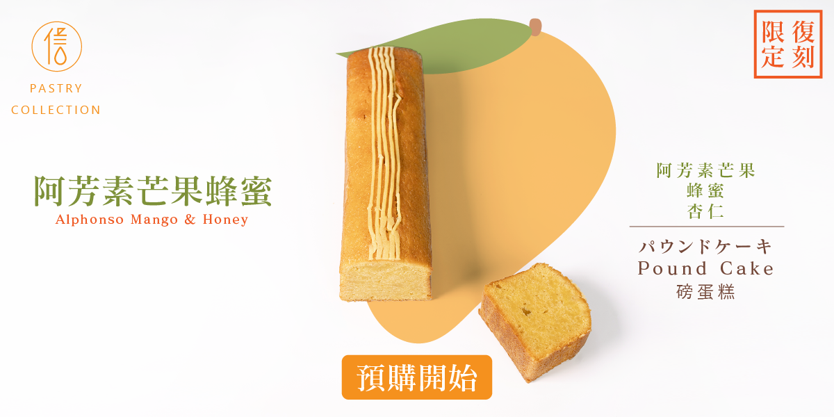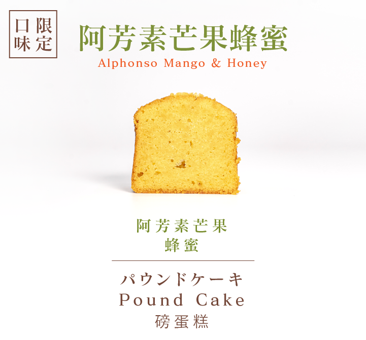 把過去的熱帶芒果磅蛋糕的配方調整復刻,加入龍眼蜂蜜與蘭姆酒柔化阿芳素的狂野香氣,蛋糕體這次設計沒有加入任何餡料,呈現芒果跟蜂蜜單純又明確的美味,入口蜂蜜的香氣,待蛋糕化開時芒果香氣慢慢湧出,混合蘭姆酒帶來的果香,襯托出阿芳素獨有的濃郁香氣,最後龍眼蜜的餘韻迷漫著。
