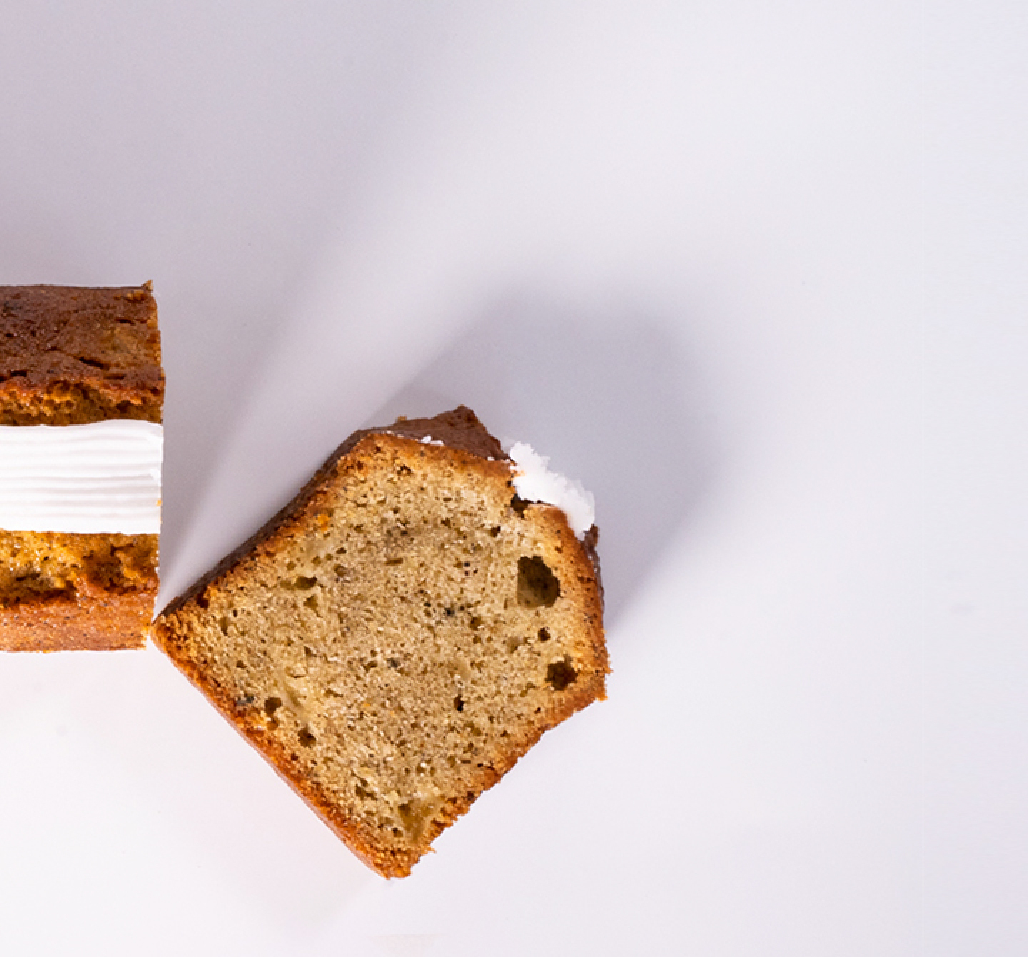 「磅」蛋糕的名字是來自於原配方是「1磅麵粉、1磅砂糖、1磅蛋、1磅奶油」,這是經典配方;而我們的磅蛋糕比例上重新調整,帶來外層焦香,內部棉密濕潤的究極口感,秘訣是在於無水發酵奶油以及香気材料的使用!