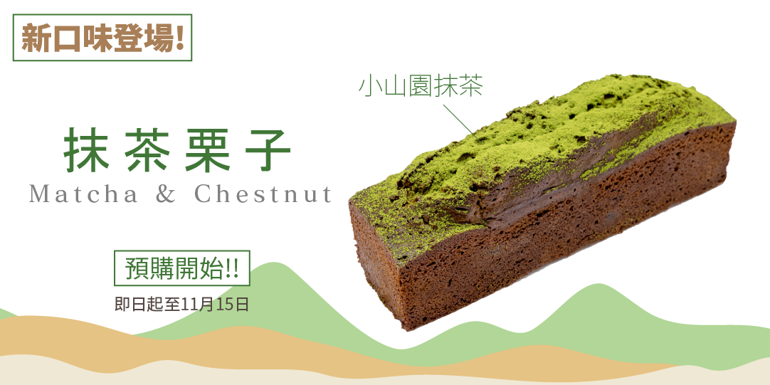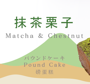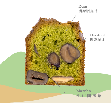 「要濃香精緻的抹茶口味!」抹茶口味在1年多前已經在試了,一次又一次的失敗跟不滿意,到現在過了1年多,已經驗跟配方重新分析,也找到了適合做甜點的抹茶,很多時候一個口味的誕生,是細膩的等待。以抹茶為主軸,加上糖煮栗子的甘甜,有別於其他全部口味,微苦帶來清新雅致的味道,加上蘭姆酒、香草、杏仁的香氣,終於做出了我滿意的抹茶磅蛋糕!