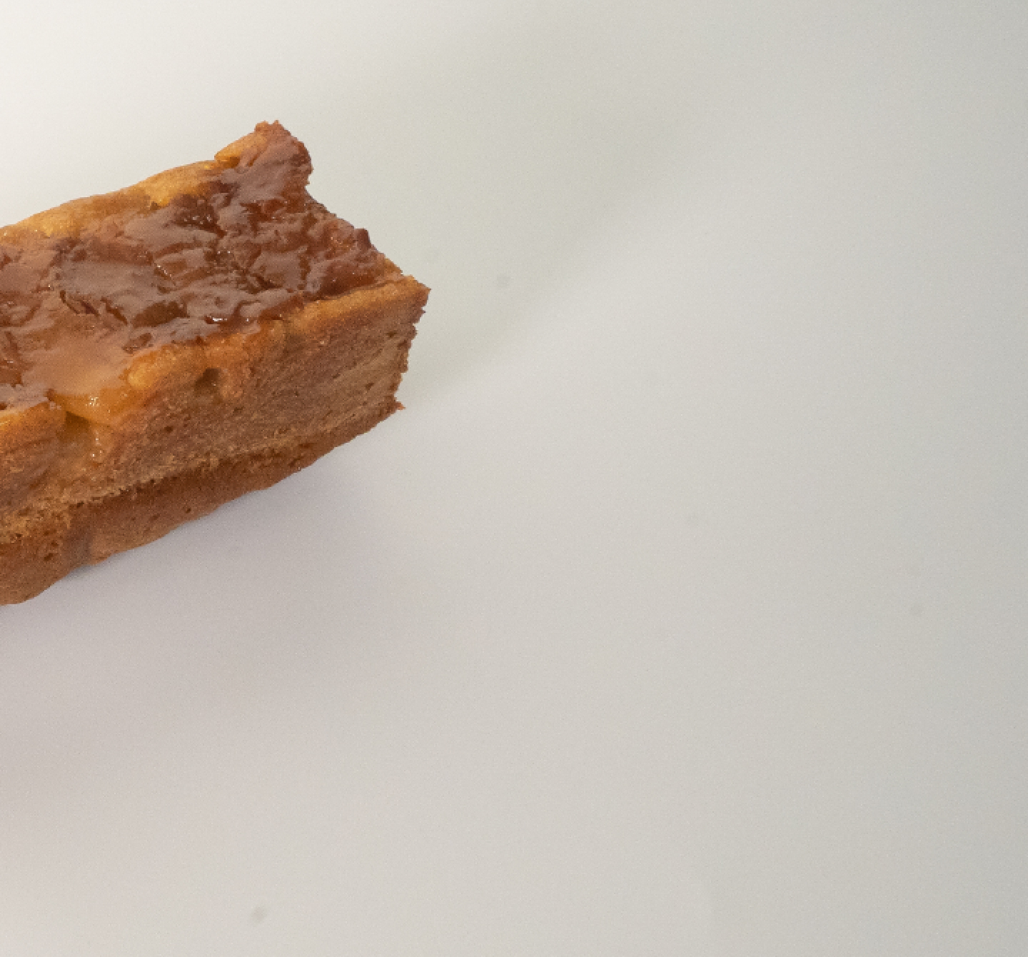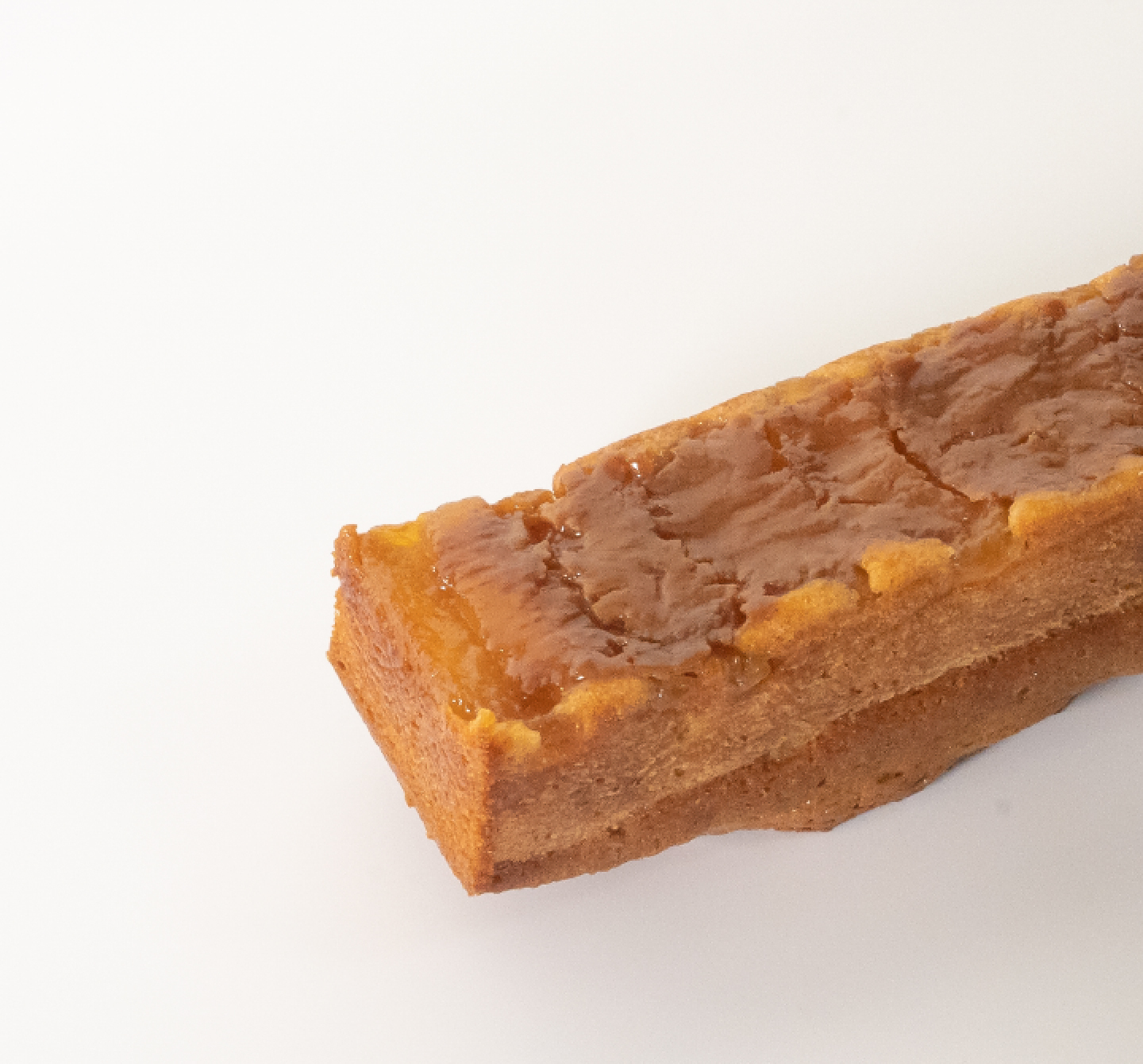 「磅」蛋糕的名字是來自於原配方是「1磅麵粉、1磅砂糖、1磅蛋、1磅奶油」,這是經典配方;而我們的磅蛋糕比例上重新調整,帶來外層焦香,內部棉密濕潤的究極口感,秘訣是在於無水發酵奶油以及香気材料的使用!